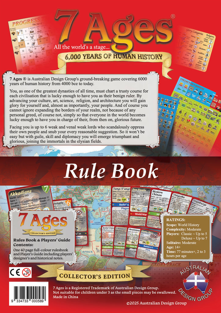The 7 Ages Collector’s Edition Rulebook has 40 A4 pages of the rules, Players’ notes, Designer’s notes and all the other reference material to play the world’s best world history game.