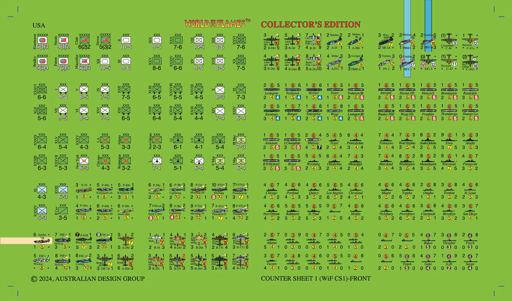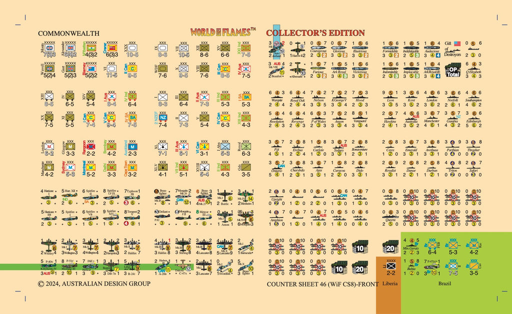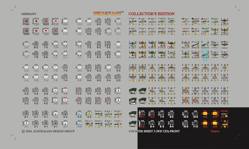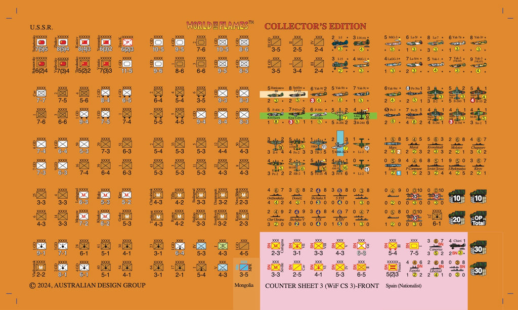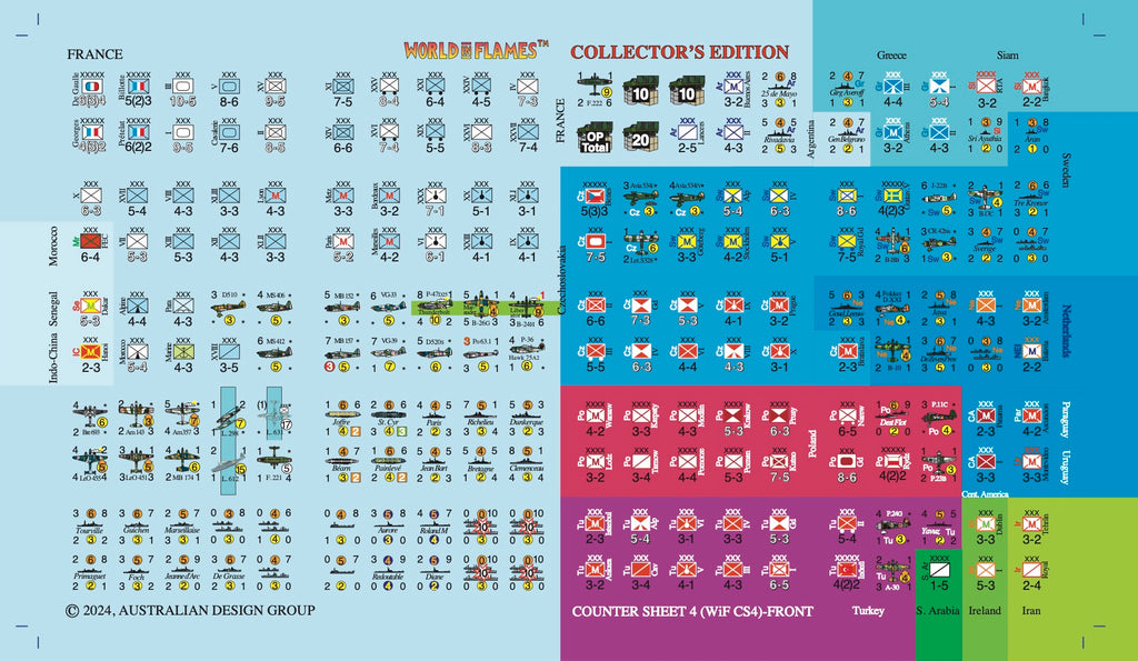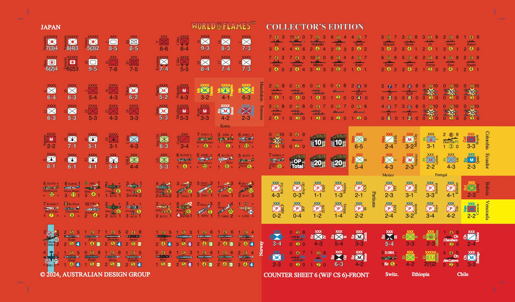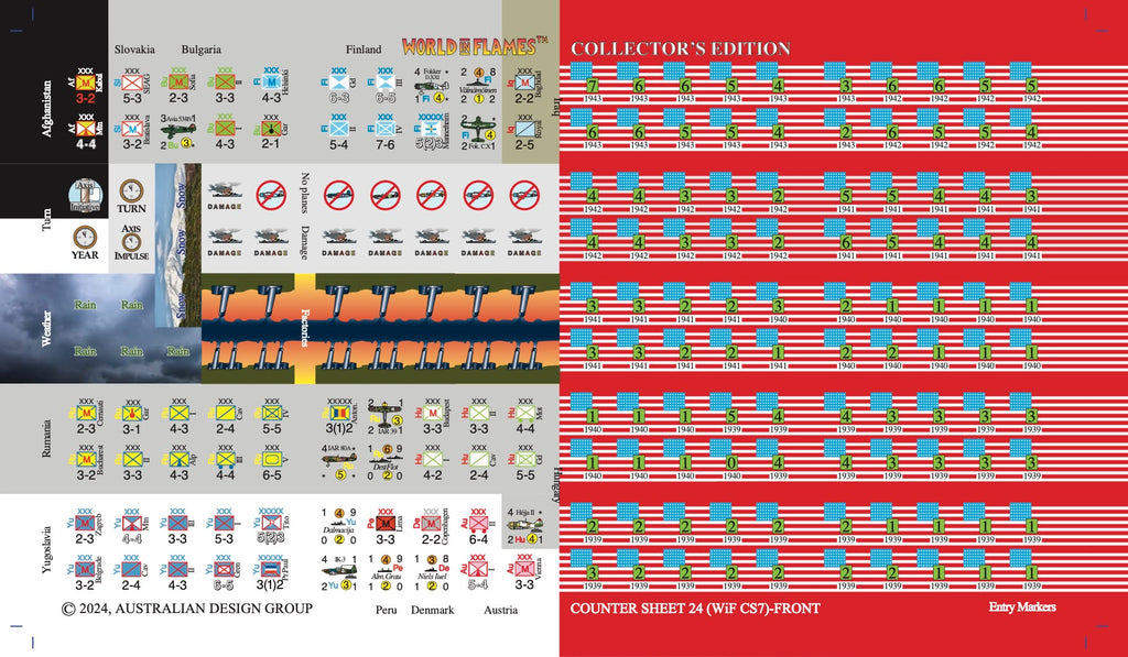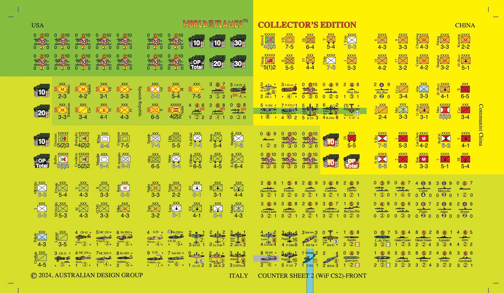 The World in Flames Classic Counters set consists of 1600 (12.7 x 12.7 mm) counters representing the armies, navies and air forces of World War II (countersheets 1-6, 24, 46 and 55). Please note that the images on this page are low resolution (for faster page upload). The components in the game are all high resolution.