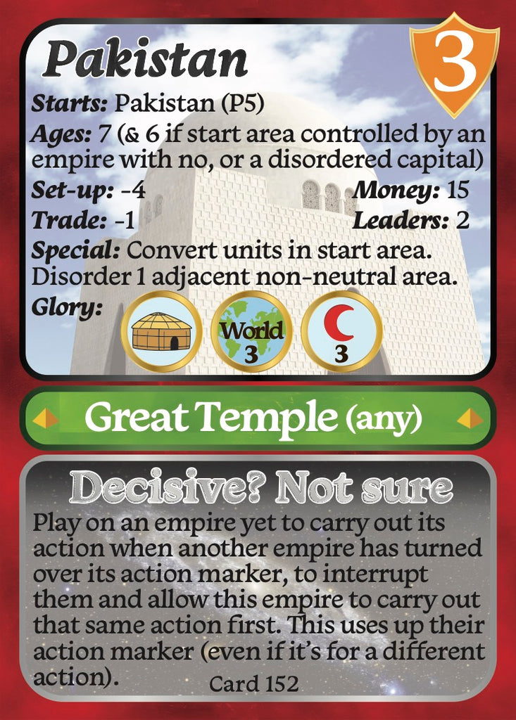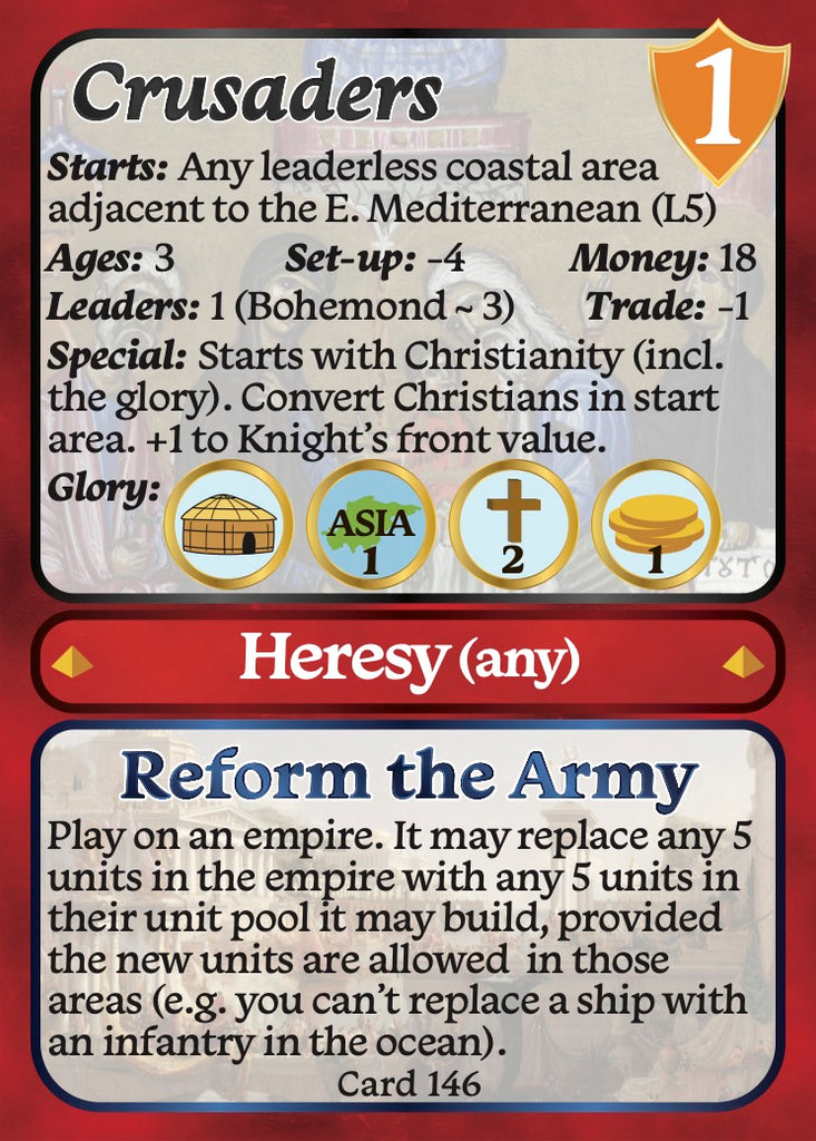 The centrepiece of the expansion is the temples playable in option 12, Deux Vult. You can build (for free) one temple per civilise (and one more if you have a religious leader) in any area without a temple. Unlike Classic 7 Ages, you don't get glory for being most religious based on how many areas you have, now it’s how valuable your church is.