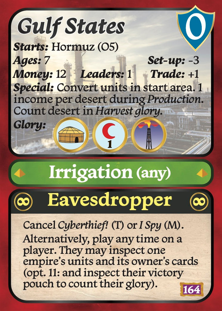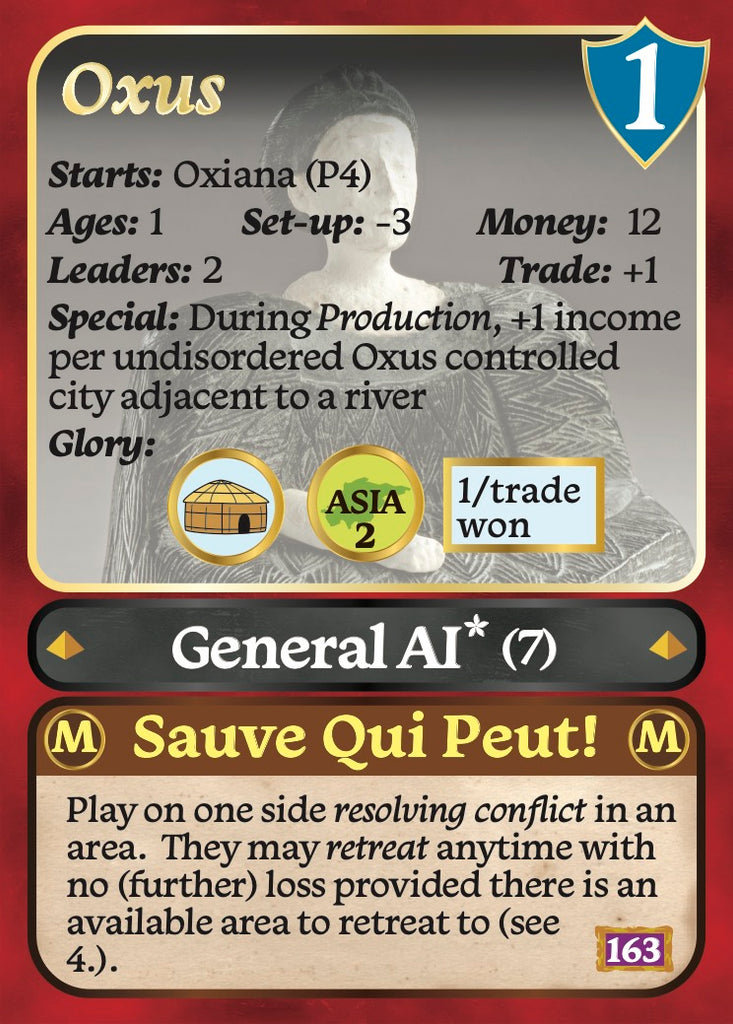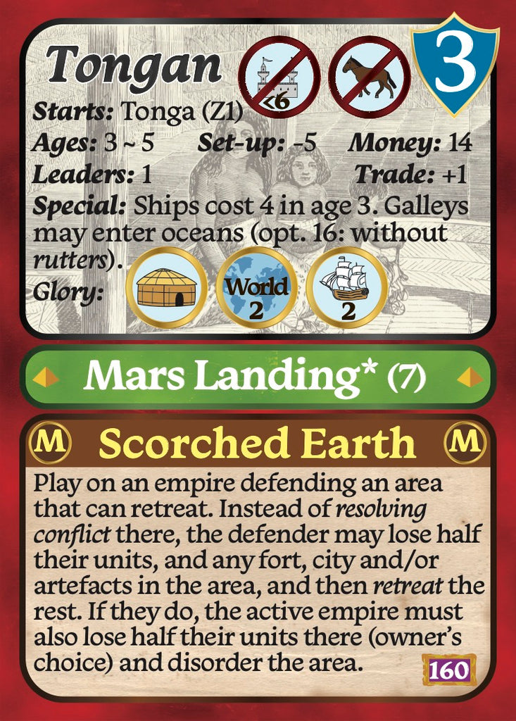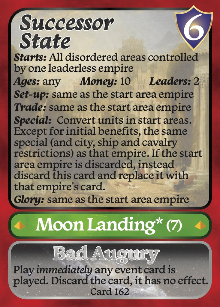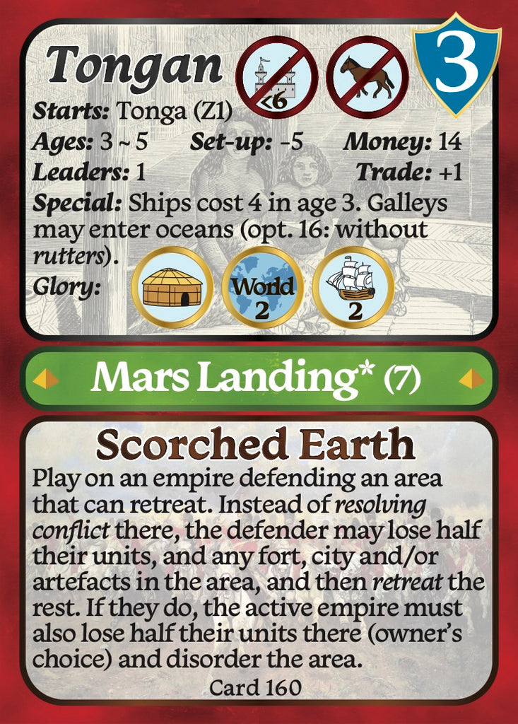 The heart of the system though is secret glory, option 11. If you are tired of "let's gang up on the leader" then this is the option for you. Every time you get glory, you don't record it on the track, you place the glory tokens into your velvet secret glory bag. Sure you can tell how lumpy the bag is but are those 1s or 200s? There are events that pull the veil away but that is spotty and infrequent, particularly towards the end of the game when every glory counts.